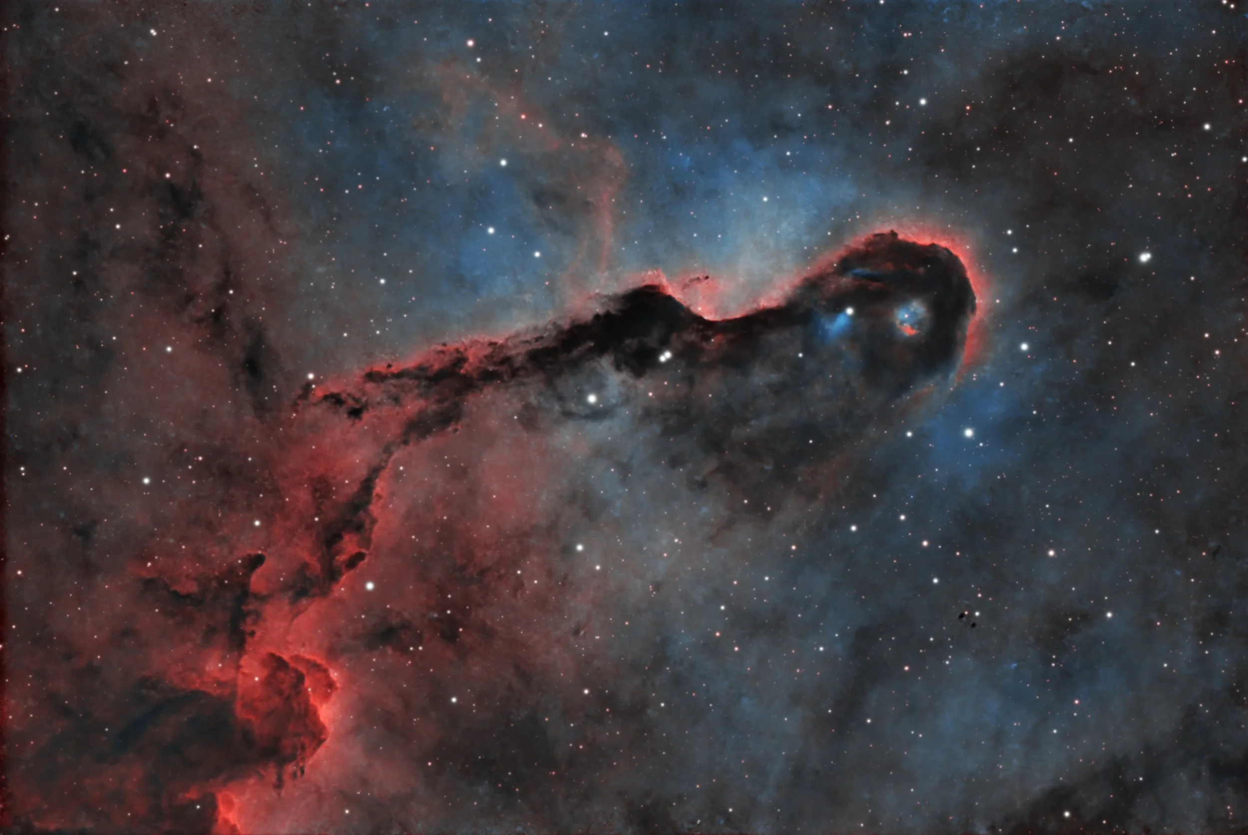 The Elephant's Trunk Nebula is an elongated region of interstellar gas and dust located within the larger emission nebula IC 1396 in the constellation Cepheus. This dark structure stretches across several light-years, shaped by intense stellar winds and radiation from nearby young, massive stars. Rich in molecular hydrogen, it is an active stellar nursery where new stars are born amid dense clumps within the nebula.